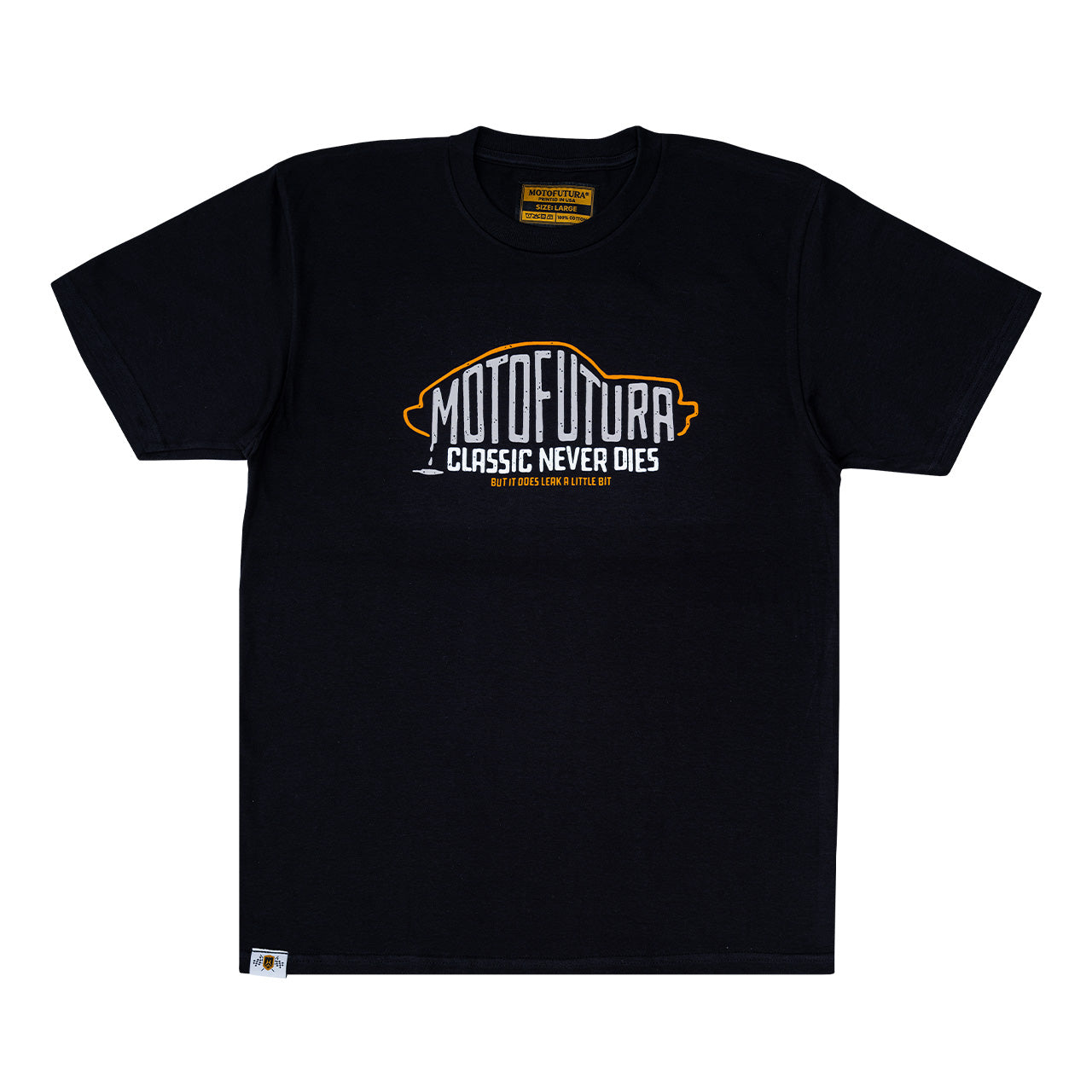 Show your appreciation for the old school with our "Classic Never Dies" shirt. Screen printed in the USA with a front chest piece and a Motofutura logo hem tag on a black cotton t-shirt.