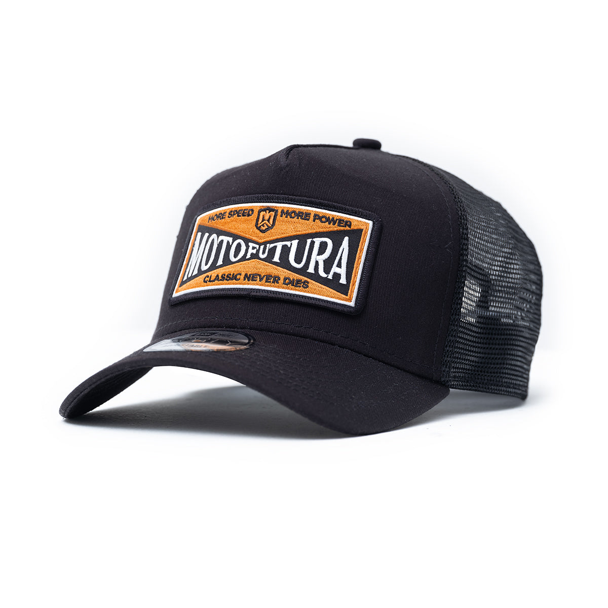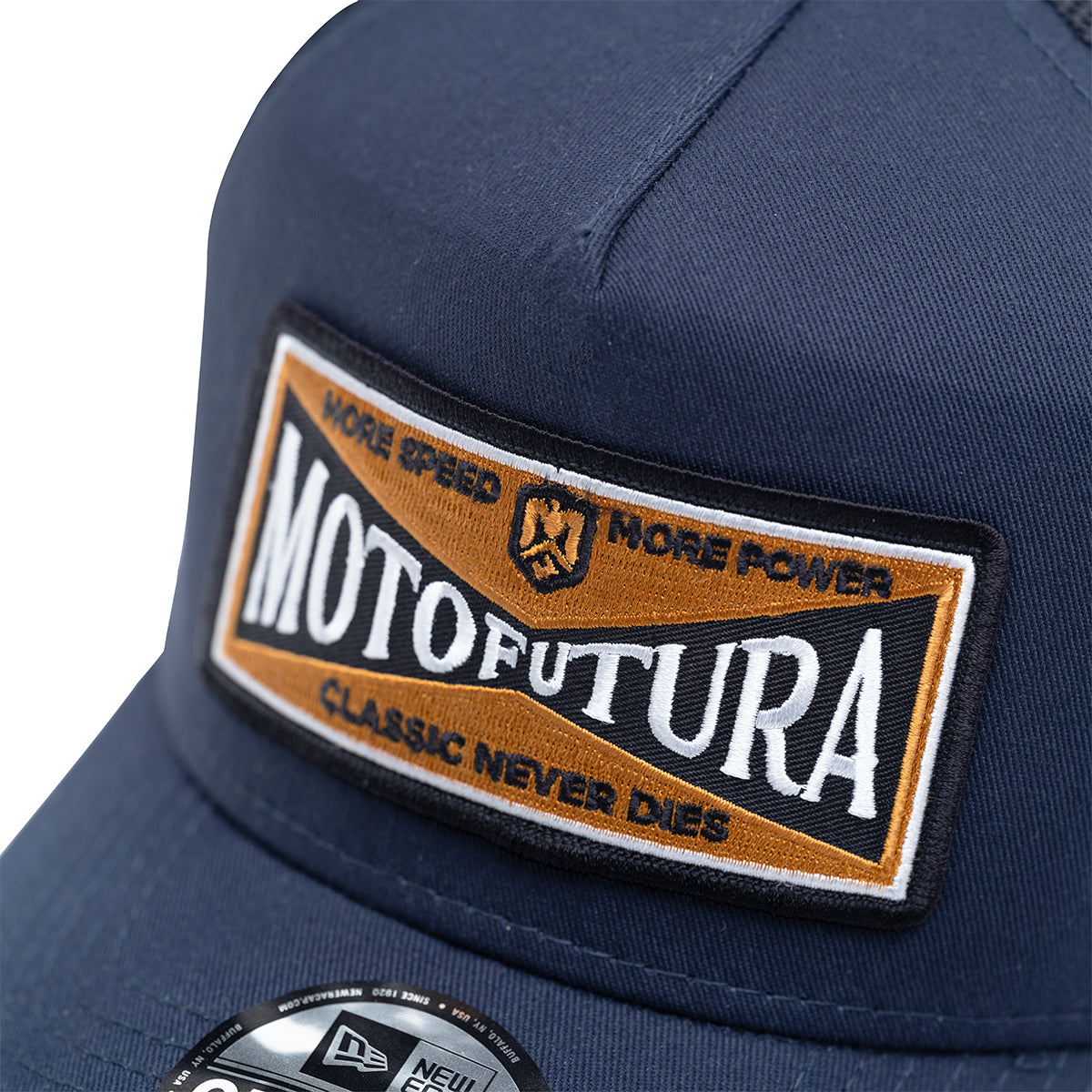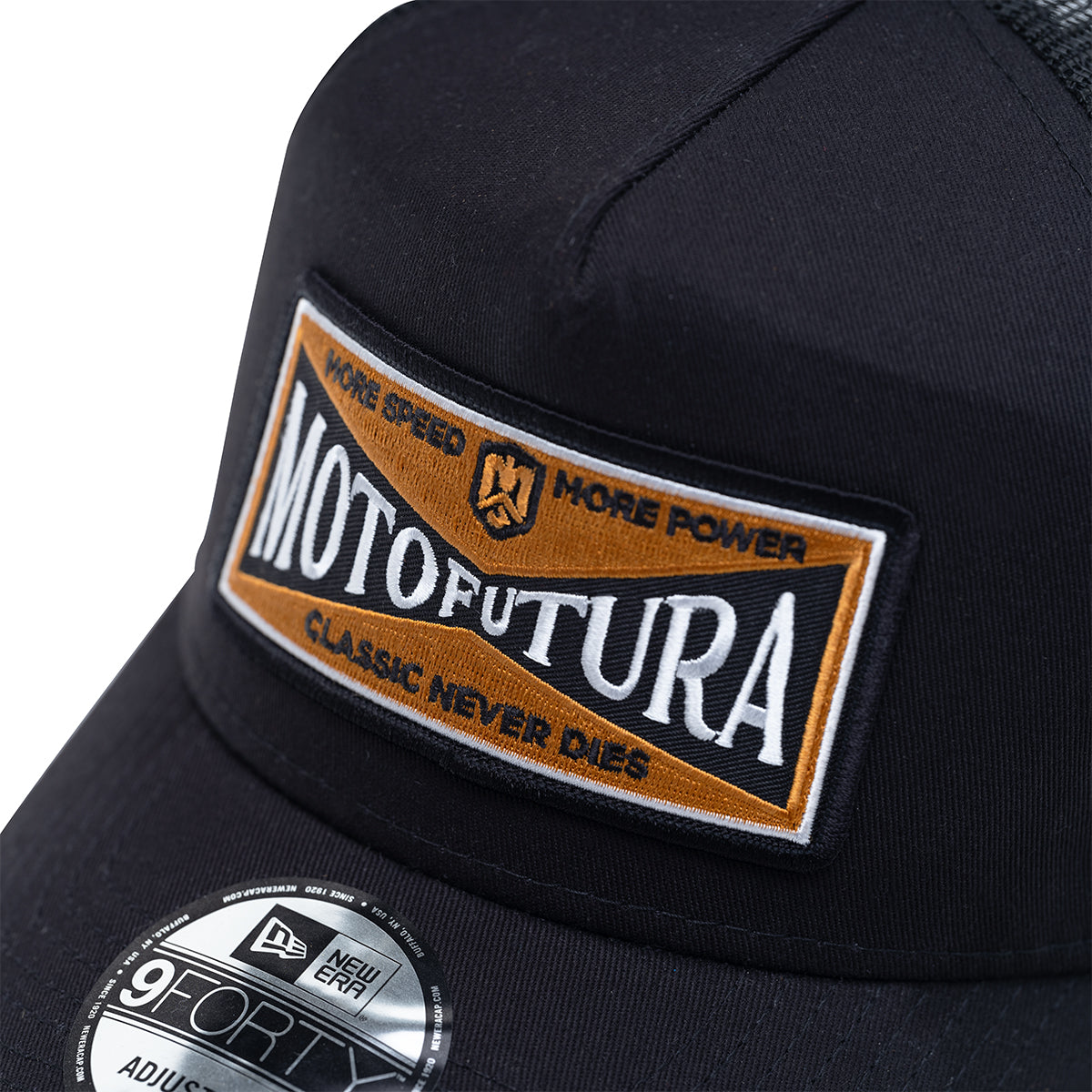 Black mesh New Era® 9Forty curved brim snapback hat with the Motofutura logo in full brand color.